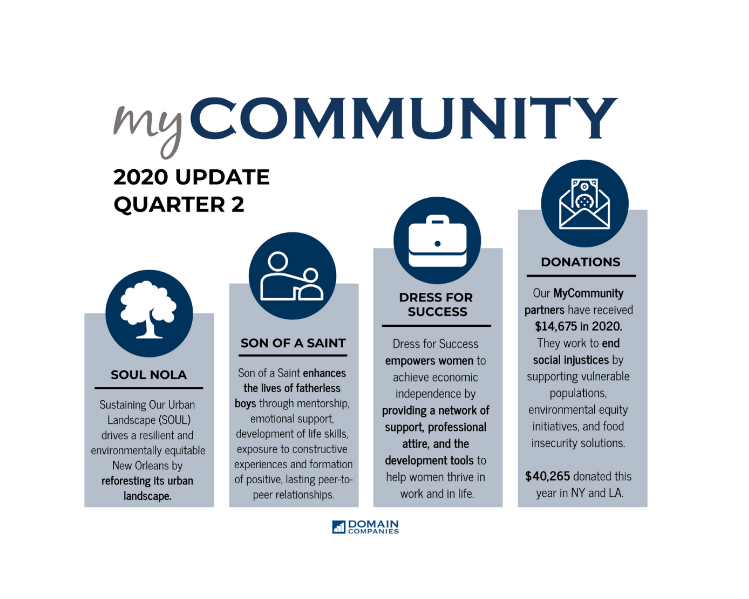 Through our Domain MyCommunity Program, The Shop supports local non-profit organizations with financial assistance, volunteer opportunities for members and employees, and raised awareness. We’re honored to have empowered our partners during a great time of need in Q2. So far in 2020, our partners SOUL NOLA, Son of a Saint, and Dress for Success New Orleans have received $14,675 in contributions from our coworking community.