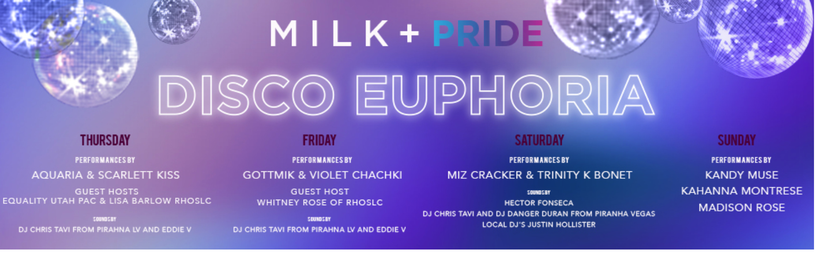 Kick off Pride Weekend right with the first night of the M I L K + PRIDE Disco Euphoria event line-up! Not only do all ticket sales benefit Equality Utah directly, but Salt Lakers will enjoy an incredible line-up of Queens. The main event features winner of Ru Paul’s Drag Race Season 10, AQUARIA! Grab a drink and your best Disco fit for a night you won’t want to miss. A full run down of their events for the weekend are pictured here: