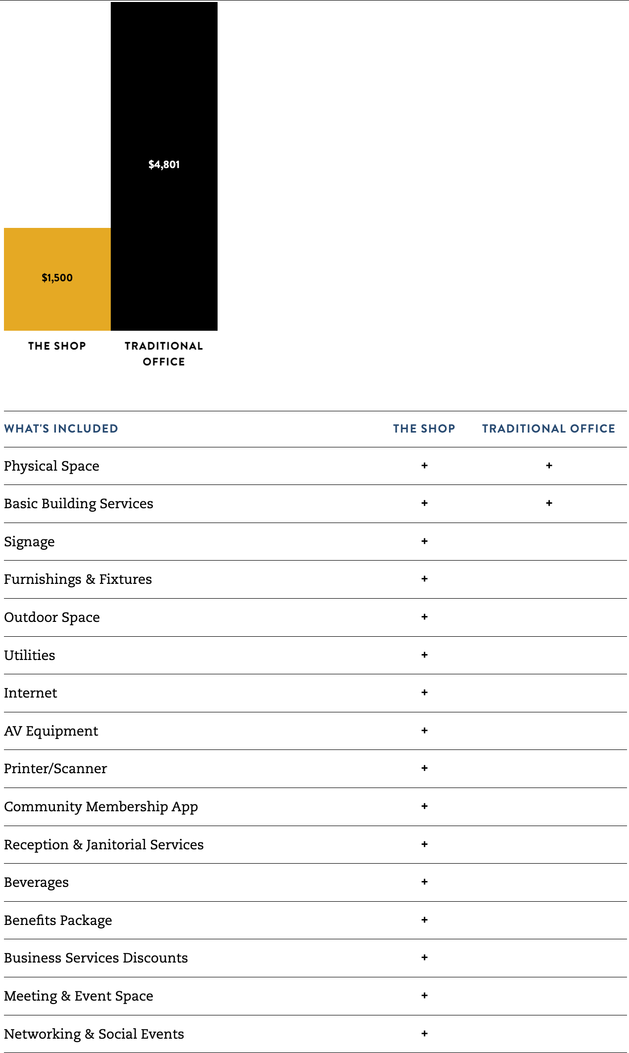 When you compare the costs, the advantages of The Shop Workspace become evident. A private office at The Shop for $1,500 per month not only provides a beautiful and fully equipped space but also eliminates the headache of managing additional expenses.