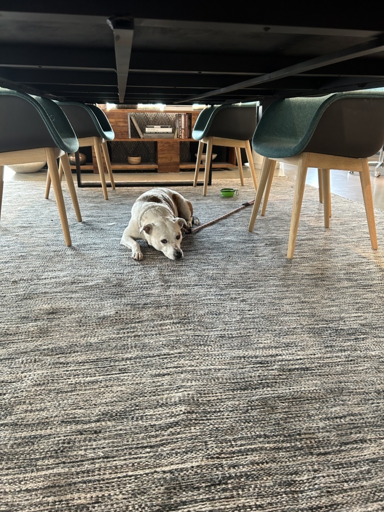Cookie gets remarkably relaxed at The Shop. I can walk away to get coffee or go down the hall and she stays put.